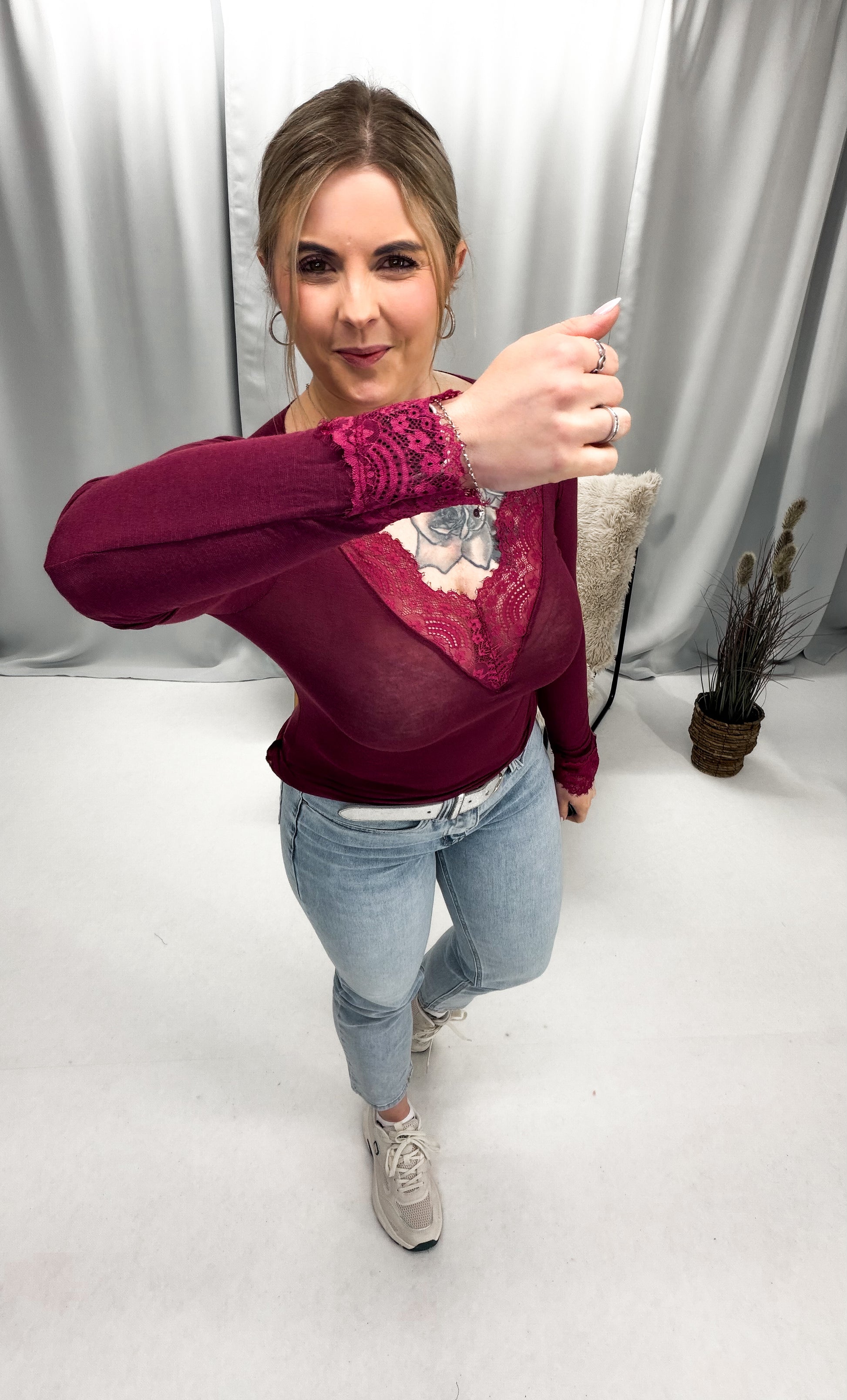 Cashmere langarm Shirt mit Spitze und V-Ausschnitt, halbtransparent
